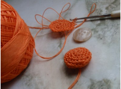 При переходе к вязанию объемной части закрепляем оранжевую нить, делаем петлю и наматываем на крючок 10 петель не провязывая, крепимся к 4-й петле предыдущего ряда, протягиваем нить через всю намотку.