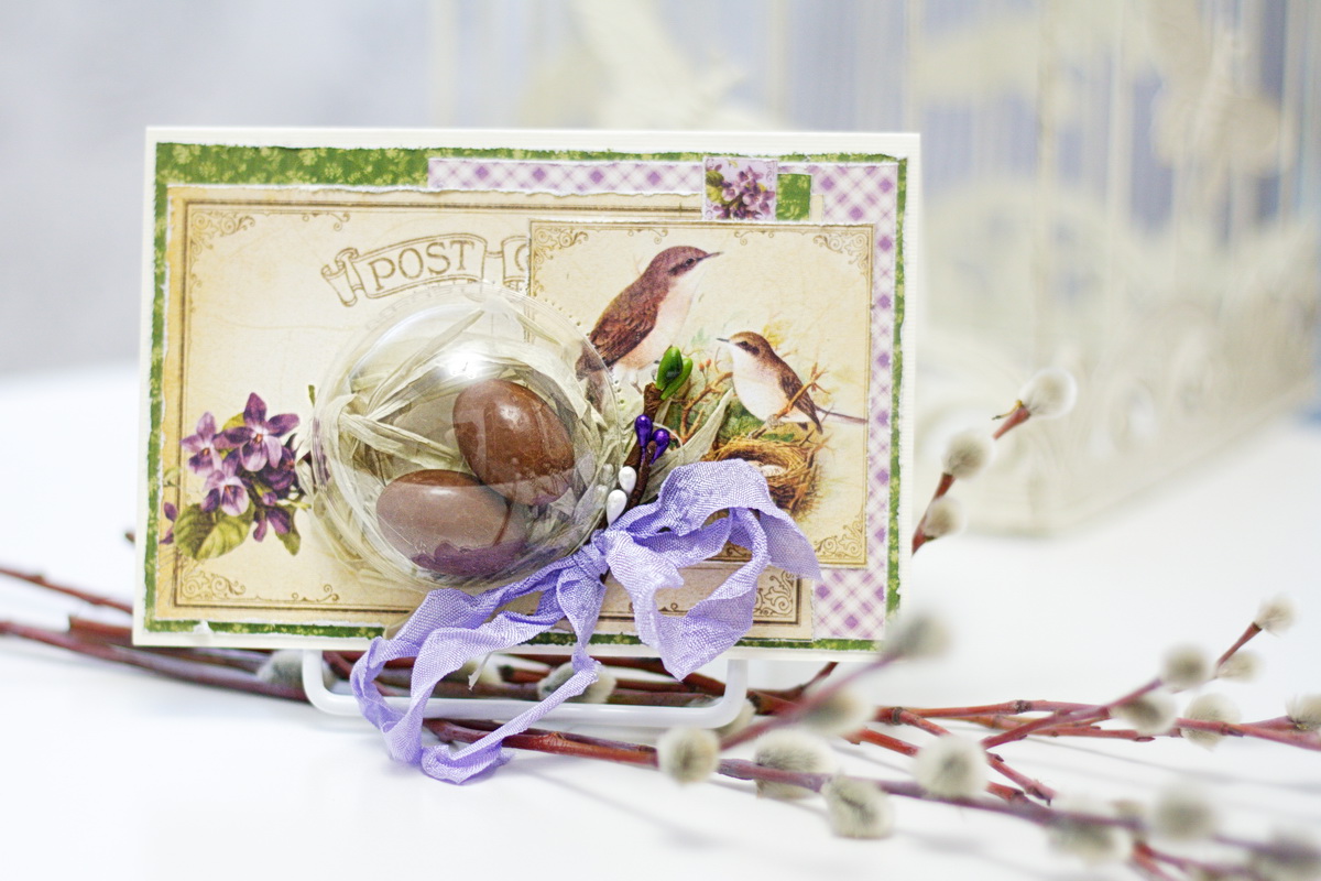 "Если у вас после новогодних праздников случайно завалялись пластиковые формы для елочных шаров, мы вполне можем "перепрофилировать" их во что-нибудь весеннее или даже пасхальное. Например, в открытку с конфетками.