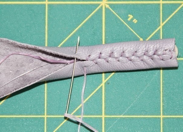 Итог будет таким. Узор косы вы можете менять, вставляя разные по ширине полосы кожи и варьируя их количеством.