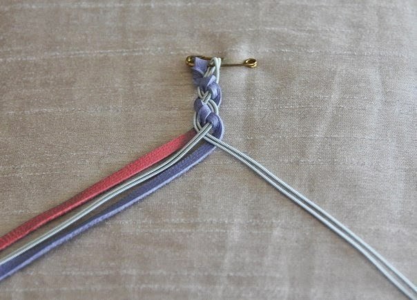 Отрезав шнуры, скрепите их на одном конце булавкой и начните плести косу.