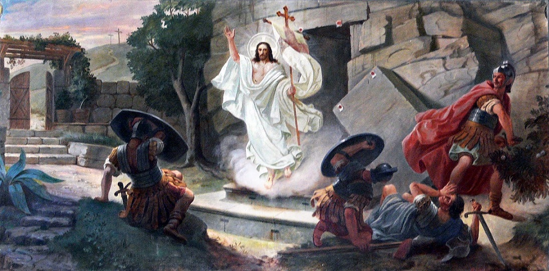 Вот что повествует Евангелие об этом славном и великом событии́. Миновала Великая Суббота, в ночь на которую Иосиф Аримафейский и Никодим погребли Тело Иисусово. Гробовая пещера, в которой Его положили, была запечатана огромным камнем; при ней стояла стража – первосвященник и фарисеи убедили Пилата и приставили ее для охранения гроба до третьего дня, чтобы ученики Христовы, пришедши ночью, не украли тела Его и не сказали бы народу: воскрес из мертвых (ср.: Мф. 27, 64). Но на третий день после Своих крестных страданий и смерти Иисус Христос воскрес из мертвых, согласно писаниям пророков. Это совершилось после полуночи с субботы на следующий день (ныне воскресенье). Находившиеся на страже воины видели, как по Воскресении Спасителя Ангел отвалил камень от гробовой пещеры, и были свидетелями происшедшего в то время землетрясения. Вид Ангела, отвалившего камень, по словам евангелиста Матфея, был как молния, а одеяние его бело как снег (ср.: Мф. 28,3).