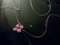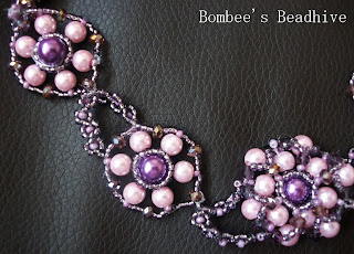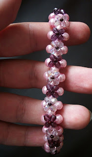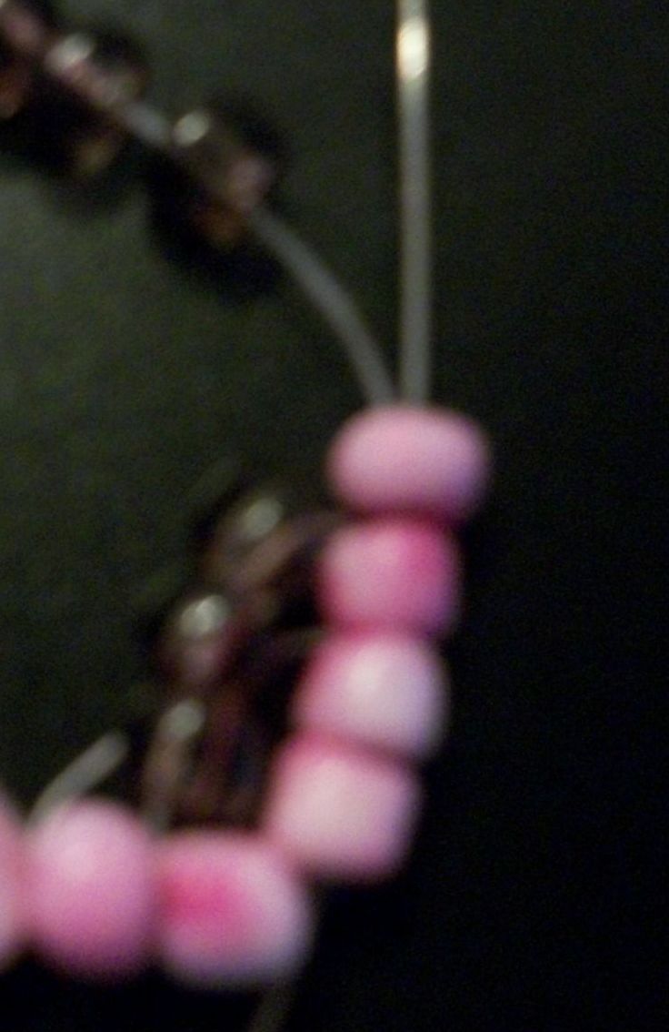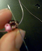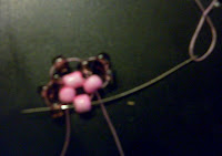 Ezt kapjuk.Ezután átvezetjük a tűt az alap ( a képen rózsaszín) következő (lefelé)gyöngyébe. Majd felveszünk 2 gyöngyöt, s átvezetjük a tűt, az előzőekben felvett 3 gyöngy jobb szélső gyöngyén, illetve az alapnak azon gyöngyén, amibe előtte öltöttünk. (kép)
