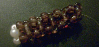 Átöltünk az új alap következő gyöngyébe. (Ne felejtsd el, én mindig 90 fokkal elfordítom a munkát). Majd felveszünk 2 gyöngyöt, s visszaöltünk az előzőleg felvett jobb szélsőjébe és az alapba. (kép) Ezután ismét tovább eggyel az alapban, ismét 2 gyöngy, ismét visszaöltés. Tovább az alapban, tovább az első gyöngyhöz, felveszünk egy gyöngyöt, s visszaöltés a 3 gyöngyön át...és így tovább, és így tovább.