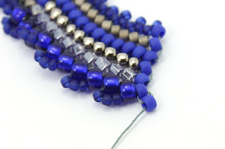 Плетем еще один ряд - завершающий, с бисером 11/0 #48F. Проплетаем этот ряд в обратном направлении, чтобы закрепить бисерины.