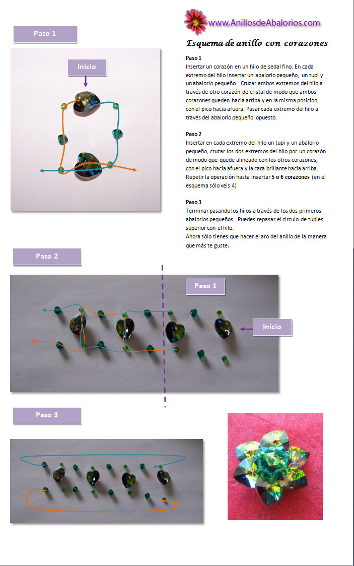 Este esquema es válido para realizar anillos con 5 o 6 corazones de cristal. Podéis probar distintas combinaciones y colores.