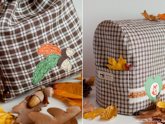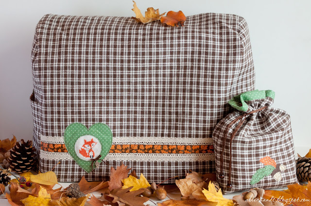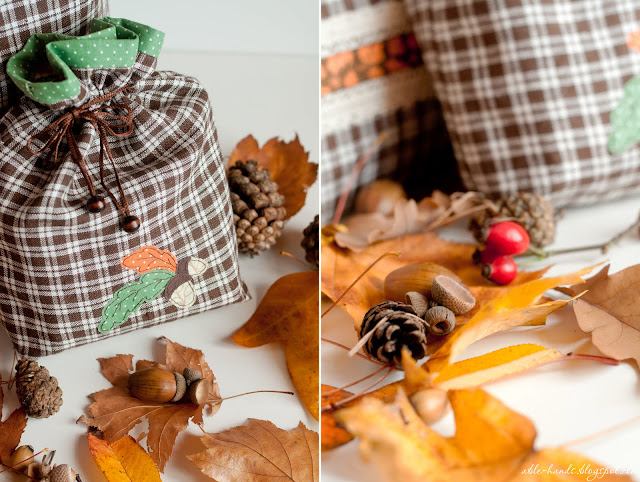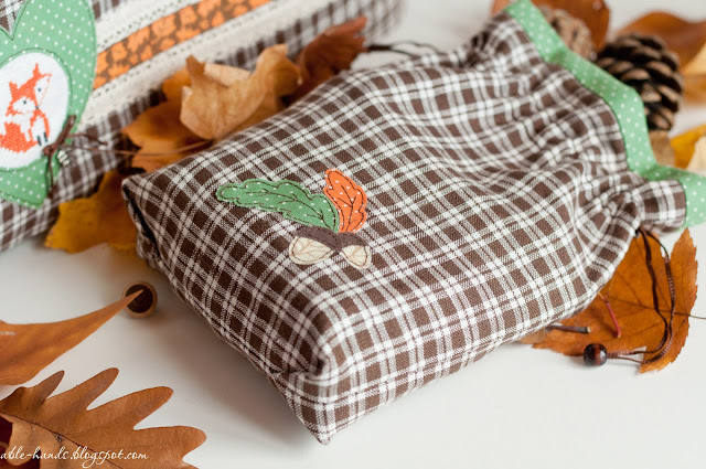 остановила свой выбор на дизайне из книги "Jahreszeiten. Herbst und Winter" от Christiane Dahlbeck (эти милые зверята еще с прошлого года не давали мне покоя), а мешочек украсила аппликацией в виде желудей.