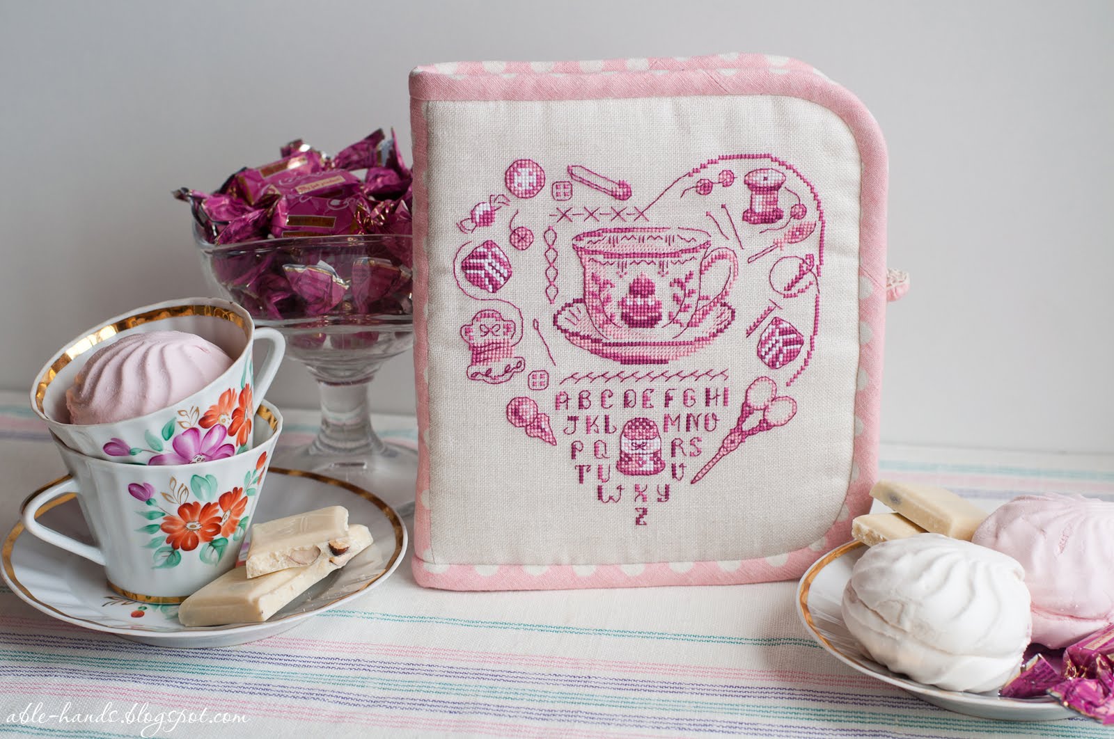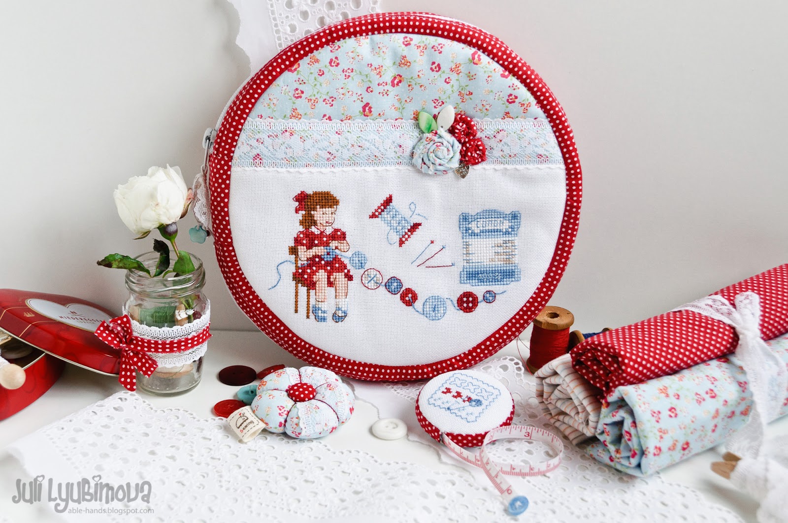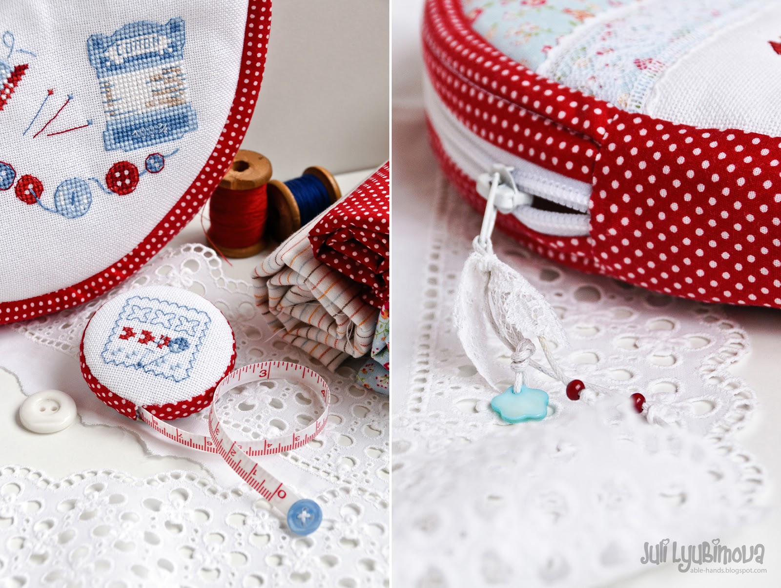 В комплект к органайзеру сшила небольшую игольницу-тыковку и обшила тканью сантиметр-рулетку. Они всегда под рукой, так как находятся на своем месте благодаря кнопкам, расположенным с внутренней стороны органайзера и с обратной стороны игольницы и рулетки. Схема вышивки для украшения рулетки из книги "Agenda 2011 Latelier de la brodeuse au point de croix".
