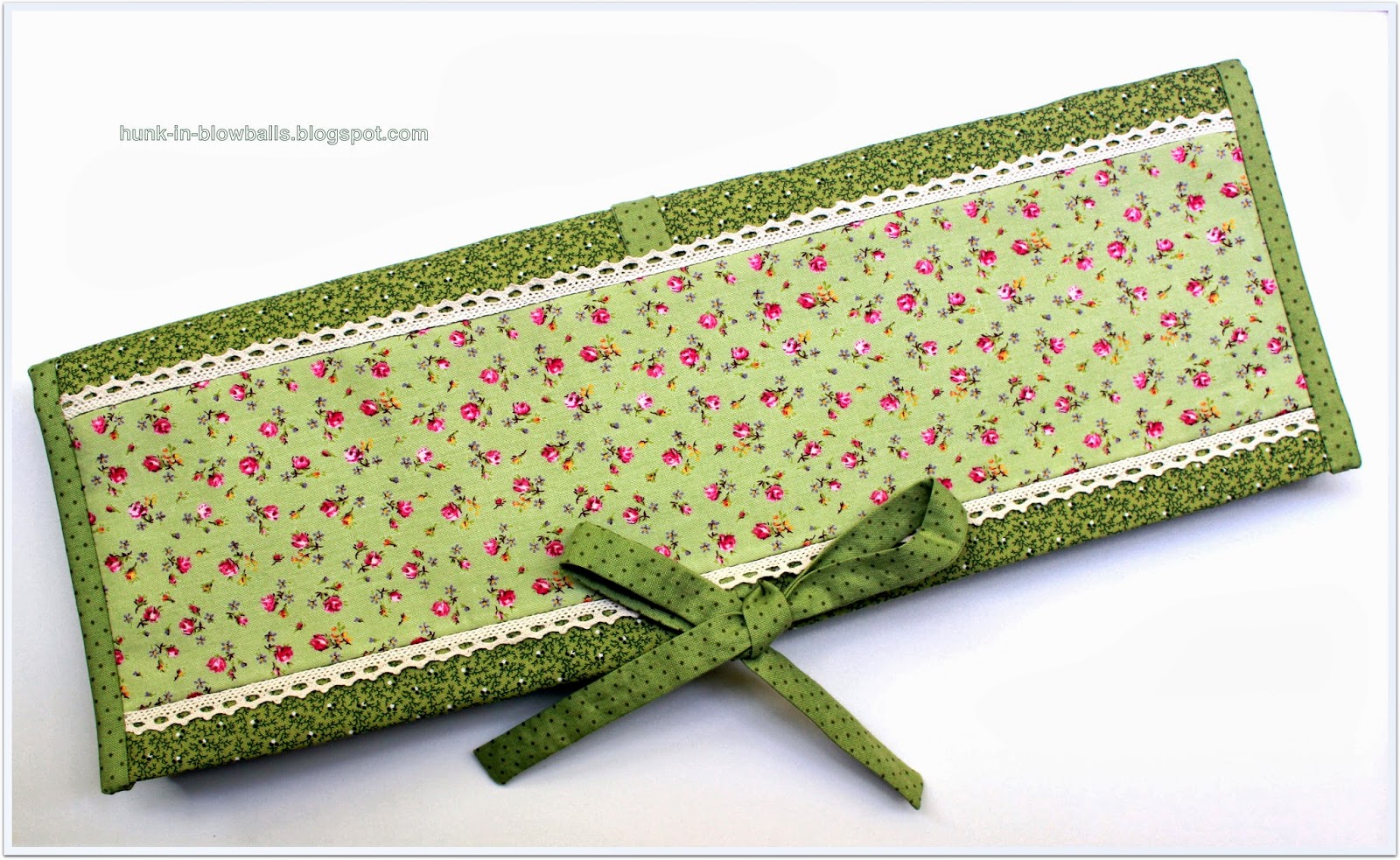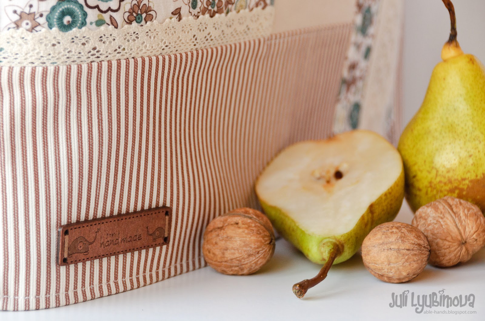 Сумочка-органайзер снаружи имеет три кармашка: два обычных и один с небольшими отделениями (например, для спиц/крючков или ручек/карандашей). Украшена бирочкой и брошью-цветочком на булавке, которую при желании можно перевесить на другое место или просто снять. Материалы: бязь, синтепон. Размеры сумочки 19*23*18 см. Пошита сумочка по этому МК, все достаточно понятно и несложно.