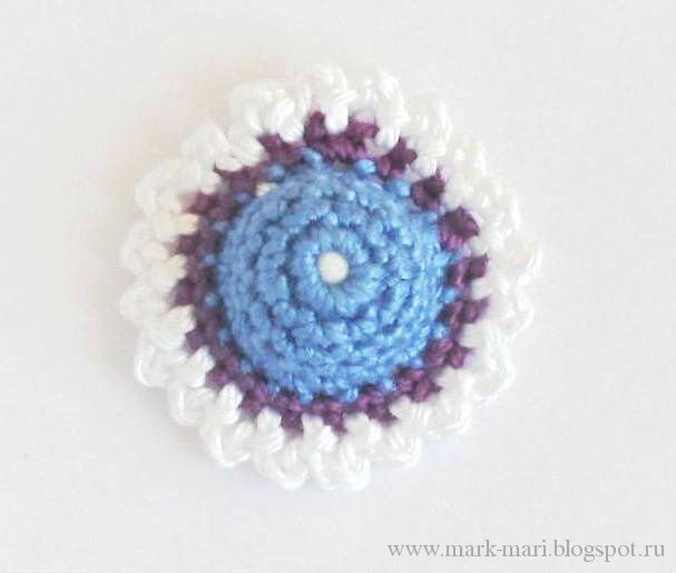 Обвяжите по схеме получившуюся "подушечку" фиолетовой и белой пряжей.
