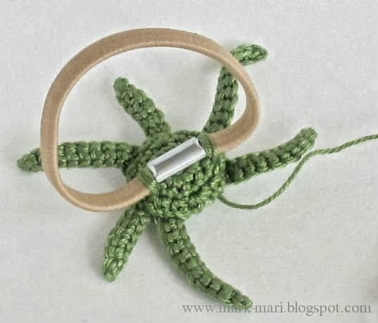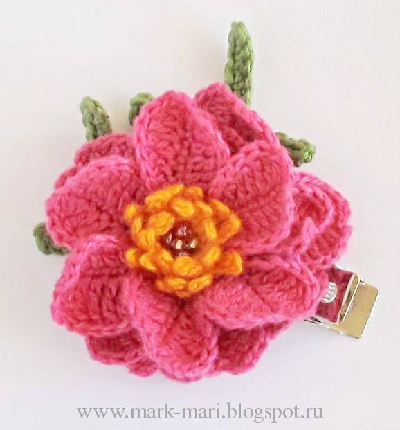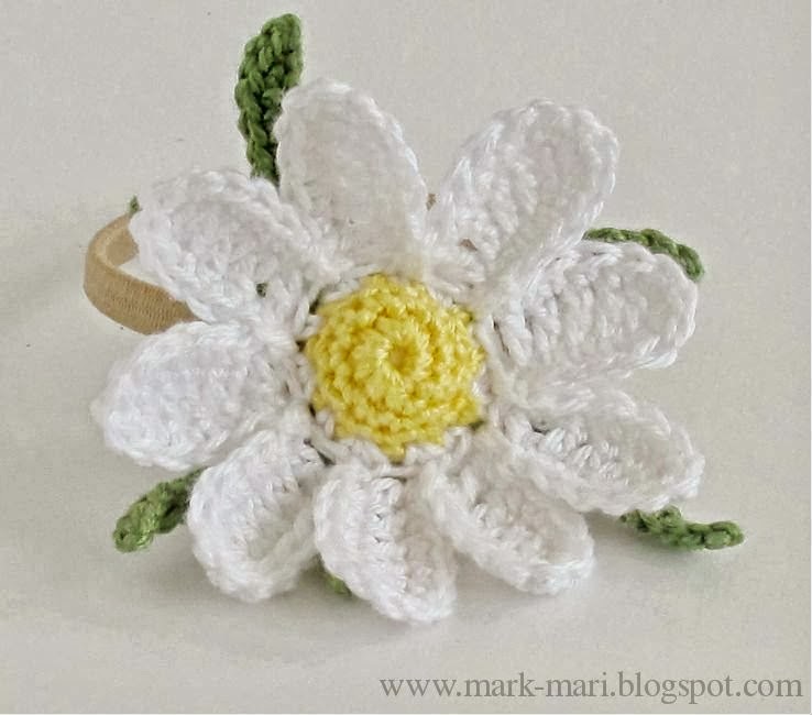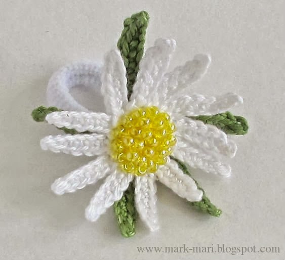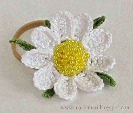 Вы можете связать маленький цветочек с тонкими лепестками на маленькой резиночке или цветочек побольше.