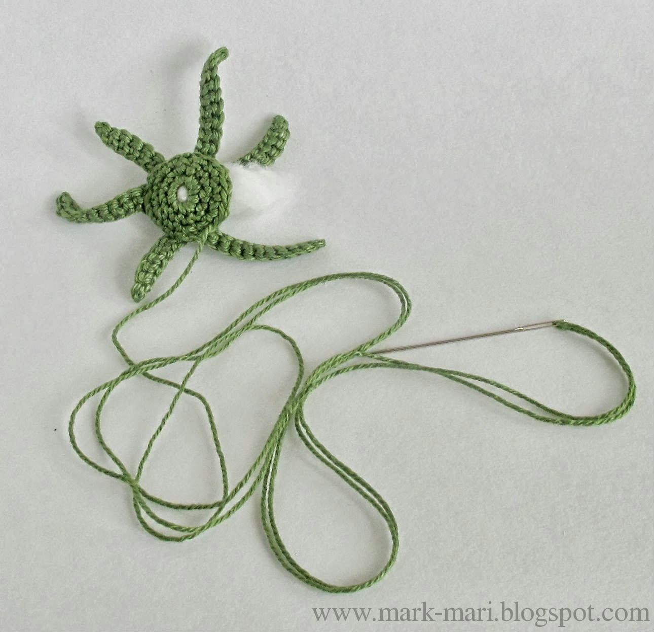 В конце вязания, перед тем как начать убавления, поместите вовнутрь бутона вату. Свяжите 2 таких бутона. В конце вязания одного из них оставьте длинную нить, обрежьте и протяните через основание бутона. Возьмите канцелярскую скрепку или кусочек проволоки и согните ее вот так: