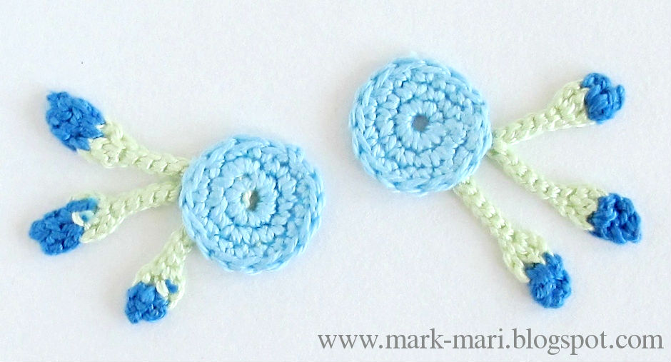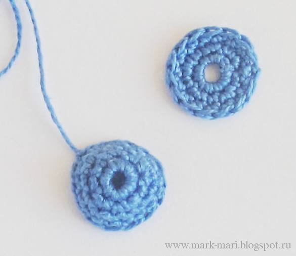 Теперь свяжем два голубых кружочка (это будут подложки). После этого, захватывая нити второго ряда подложки с изнаночной стороны, привяжем к ней стебельки и бутоны.