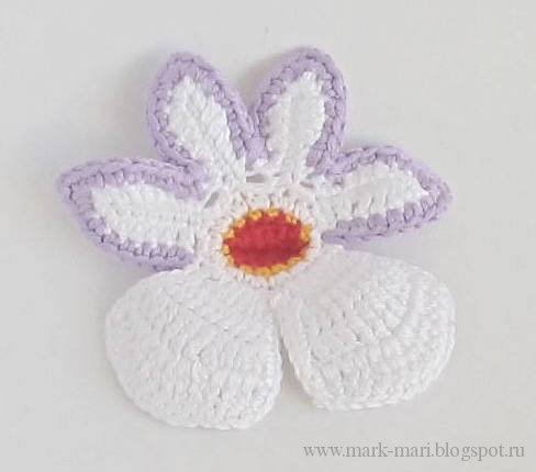 Сиреневой пряжей обвяжем 4 лепестка.