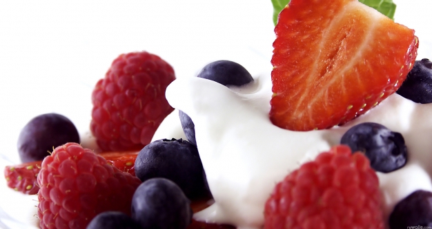 4. 90 ккал - Стакан нежирного йогурта смешайте с половиной стакана свежих ягод малины и черники.