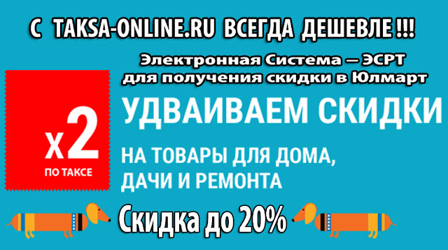 Так же дорогие друзья не забываем о том, что Скидочная Система - ЭСРТ - TAKSA- ONLINE предоставляется в режиме онлайн  бесплатную Таксу в Юлмарт. Такса Онлайн уникальный ресурс, который уже позволил сэкономить  многим покупателям при покупке в Юлмарт. В Вашем распоряжении всегда находятся 4 варианта получения скидки в Юлмарт. У нас вы можете получить самые эффективные скидки, которые дают максимум из возможного.  Все способы получения скидки многократно проверены и протестированы нашими специалистами. Вы всегда можете нам написать и мы вам поможем. Все вопросы стараемся решать как можно быстро, ведь нам дороги наши клиенты.