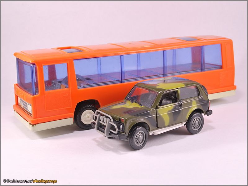 На прошлой неделе дома случайно отыскалась вот такая игрушка. Автобус BISON с инерционным механизмом. Кажется немецкий, с масштабом сложно сказать, поставил рядом НИВУ, чтобы было более понятно.
