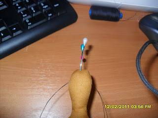 Восьмеркой укладываем нить, обходя проволку и иглы.