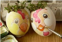 Еще есть время до Пасхи , чтобы подготовить на пасхальный стол такие веселые и оригинальные (и к тому же полезные) украшения. На праздничный стол положим венок, сплетенный из веточек лозы, в середину поставим пасхальный кулич и обложим его веселыми яичными скорлупками, в которые засеем семена кресс-салата.