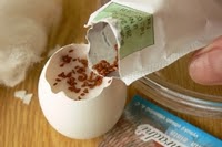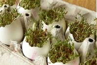 1. Скорлупки подготовим так как видим на фото, т.е. аккуратно отстраним верхнюю часть. Получится такой маленький горшочек, который наполним ватой, зальем водой и густо насыпем семена кресс-салата. Через 5-7 дней семена взойдут, а через 2-3 недели появятся листья.