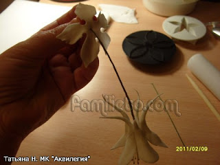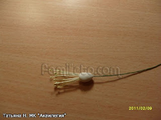 Приклеиваем получившиеся кувшинчики к обмотанной части заготовки тычинок. И вешаем сушиться.