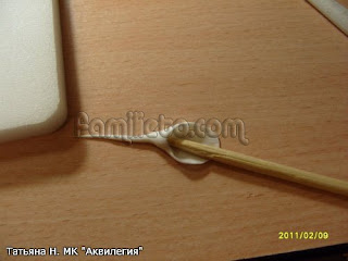 Затем надеть пятилистник, чтобы лепестки прошли между кувшинчиками, пригладить палочкой.