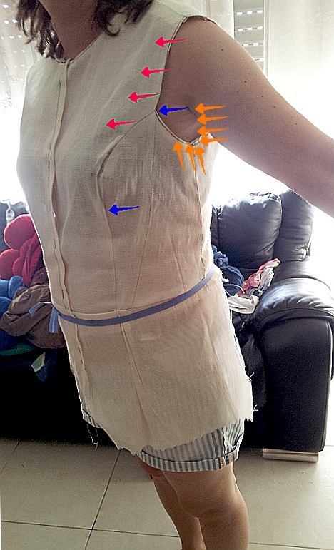 На первом фото меня три момента волнуют. На синих стрелках - слишком сильное облегание в боках и переход вверх на широкую спинку. Что за чёрные линии там в проймах?