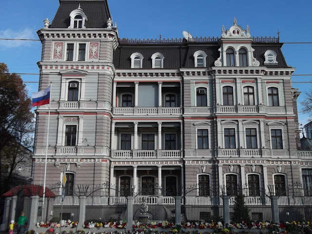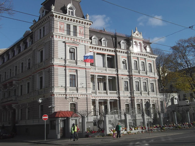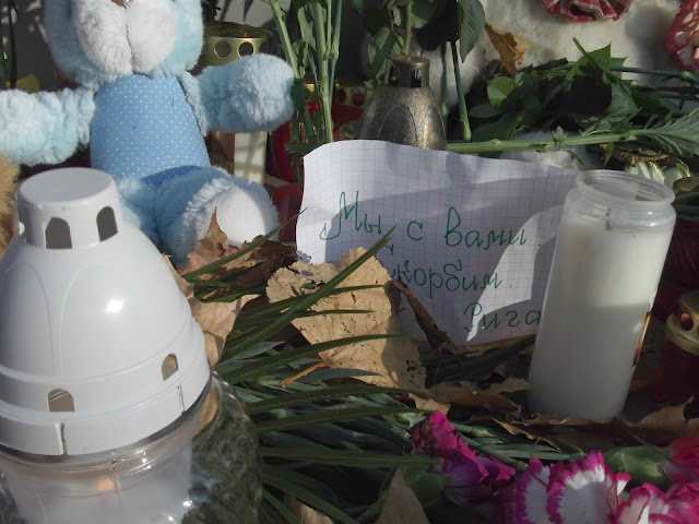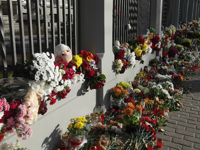 Цветы, свечи и игрушки у посольства России в Риге, памяти жертв трагической авиакатастрофы в Египте, унесшей жизни 224 пассажиров. Ноябрь 2015 год.