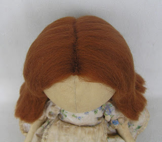 Теперь займемся волосами. Для волос я использовала шерсть для валяния коричневого оттенка. Намечаем линию пробора, начала лба и затылка. Волосы будут пришиваться по двум линиям – по пробору и по затылочной части.