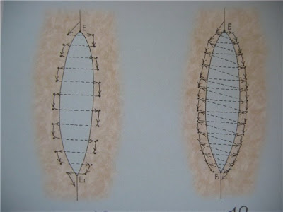 Итак, вкалываем иголку, отступив 2 мм в сторону, по направлению к центру носа, и выводим в месте второй метки ноздри. Вытягиваем нитку, и опять делаем прокол, отступив 2 мм в сторону, опять же по направлению к центру носа. У нас получаются 2 2-мм горизонтальных стежочка в местах меток ноздрей. Выводим иголку в месте первого прокола предыдущей ноздри. И хорошо, но не слишком сильно, затягиваем нитку.