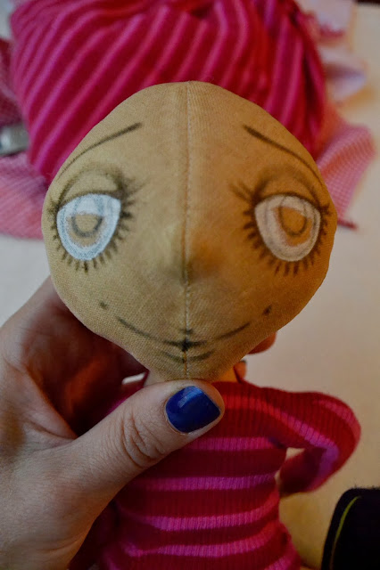 Глазки рисовать я начинаю, в основном, тогда, когда куколка уже одета или практически одета, но еще без волос), т.к. волосы, бывает, мешаю рисовать личико лезут к кисточке и цепляются за нее) Вот такой гуманоид)