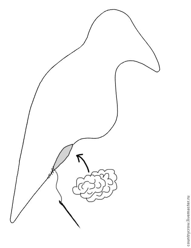 Сшиваем 2 части тела ворона на левой стороне. Оставьте отверстие для набивки. Сшиваем также крылья. Выворачиваем все части.