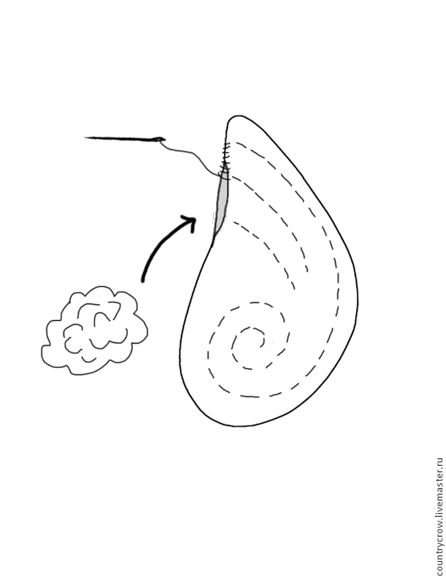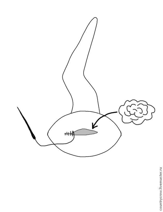 Сшиваем две половинки шляпы. Затем пришиваем дно. Делаем в дне разрез и выворачиваем на правую сторону. Набиваем верх шляпы и сшиваем отверстие.
