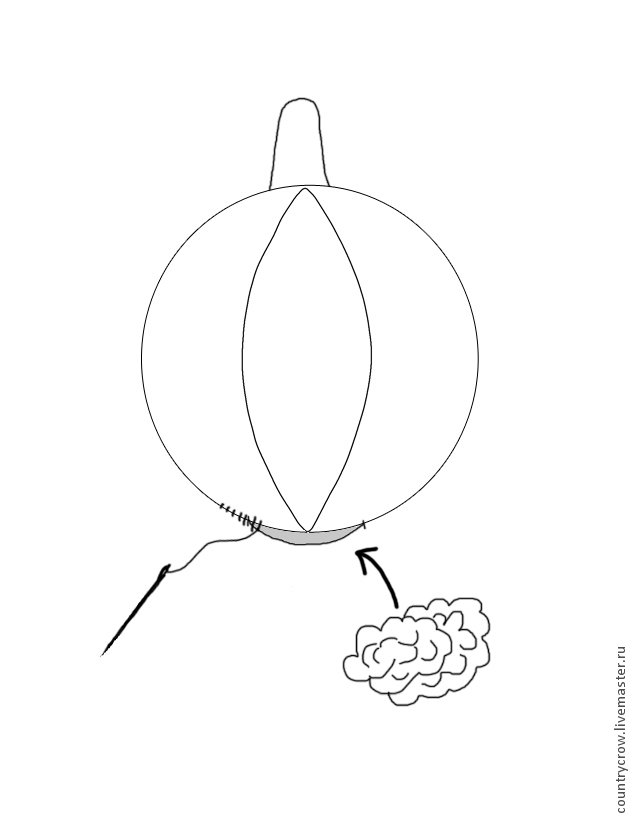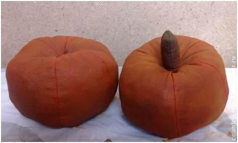 Для второй тыквы сшивает две половинки без черенка. Оставляем отверстие для набивки. выворачиваем и набиваем. Для утяжеления нужно сделать мешочек с крупой или сухим горохом и положить его на дно второй тыквы. Затем зашиваем отверстие.