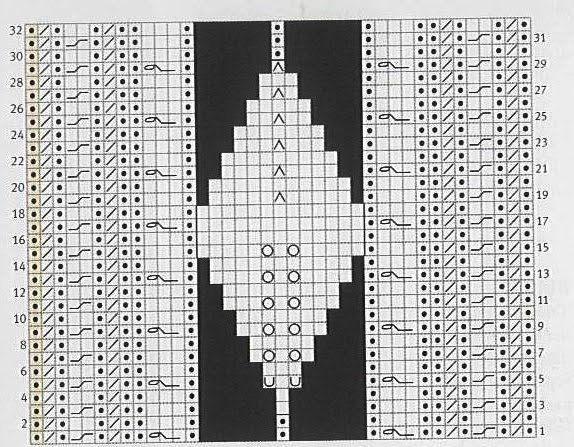 Узор в дырочку: См. схему, на которой приведены только лиц. р., в изн. р. все петли и накиды вязать изн. Постоянно повторять с 1-го по 4-й р.
