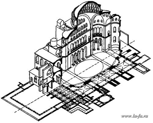 В IV в. император Константин построил в Царьграде базилику (небольшую церковь прямоугольной формы) и назвал ее церковью Святой Софии, т. е. Премудрости Божией. В 404 г. эта базилика сгорела, но в 415 г. император Феодосии Младший отстроил ее заново, однако во время мятежа 532 г. церковь снова была сожжена. Царствовавший тогда император Юстиниан уже готовился было бежать из страны, но в Константинополь вошел с войсками полководец Велизарий, который подавил восстание. В честь этой победы на месте сгоревшей базилики император Юстиниан решил воздвигнуть великолепный храм, который своими размерами и пышностью затмил бы все, что было возведено в Константинополе до него. Для работы над проектом храма император пригласил известных зодчих — Анфимия из Тралл и Исидора из Милета. Закладка фундамента храма состоялась 23 февраля 533 г., а строилась Святая София всей империей. Все доходы империи за 5 лет не покрыли расходов на сооружение храма; например, только на амвон и хоры был потрачен годовой доход от Египта. По приказу императора все провинции и города империи поставляли в Константинополь самые замечательные остатки античных зданий и мрамор. Рим, Афины и Эфес прислали колонны, которые до сих пор вызывают восхищение всех, кому довелось видеть их. Из Проконеза доставляли белоснежный мрамор, из Каристоса — светло-зеленый, из Ясоса — бело-красный, из Фригии — розовый с прожилками.