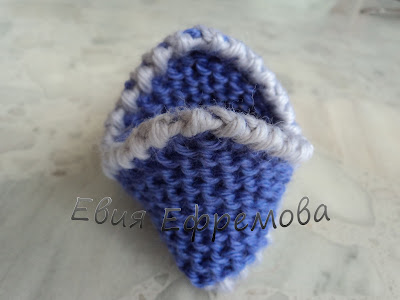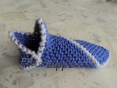 Начинаем вязать сверху зубцы (первым цветом), набираем 50 петель и вяжем5 рядов чулочной вязкой, 6 ряд-1 кромоч. *накид,2 вм.лиц.*,1 кром. Потом опять 5рядов чулочной вязкой После подшиваем зубцы спицей Затем 3 платочной вязкой вторым цветом После делим петли на три части и вяжем только среднюю часть Переходим на первый цвет и набираем кромочные петли средней части для вывязывания зубцов. Зубцы вяжем сверху: 4 ряда-чулочной вяз.;5 ряд-1кром.,*накид,2 вм.лиц.,*1 кром.,потом опять 4 ряда чулоч.,вязкой После подшиваем зубцы спицей Затем вторым цветом на всех петлях башмачка вяжем платочной вязкой1,5-2 см (полнота башмачка).Снова вяжем первым цветом зубцы -4 ряда чулочной вязкой,5 ряд-1кром.,*накид,2 вм.лиц.*,1 кром.,после опять 4 ряда чулоч.вязкой.После подшиваем зубцы спицой. Переходим на подошву которую вяжем вторым цветом платочной вязкой когда начинаешь вязать подошву.нужно убавлять в каждом втором ряду первые две петли вместе..потом две вместе перед центральной петлёй..провязываем центральную петлю и опять две вместе и две последние вместе