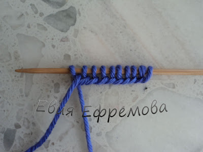 2 ряд: [ 1 петлю ( в предыдущем ряду- это снятая петля ) вяжем лицевой, накид перебрасываем с левой спицы на правую не првязывая ( накид распускаем и получается 1 длинный накид) , 1 лицевая] повторяем до конца ряда.