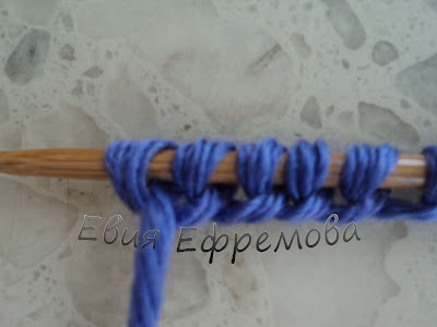 4 ряд: [ 1 петлю с двумя накидами вяжем лицевой, 1 лицевая] повторяем до конца ряда