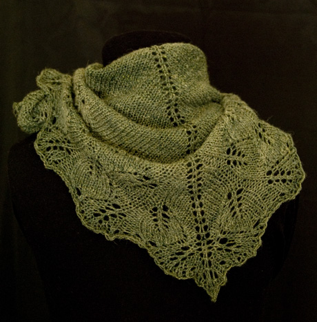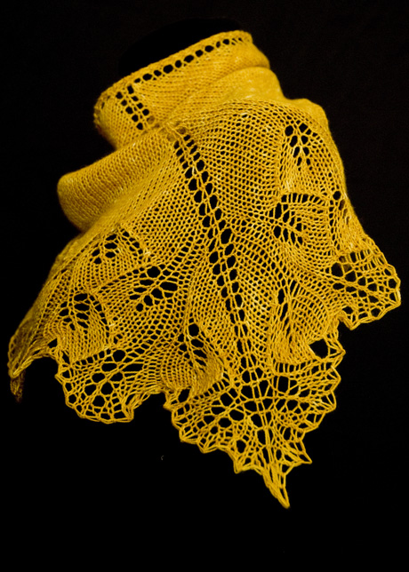 vi pela primeira vez este ponto do laço em um prato de malha pano e previsto que faria um atrativo para afiação um xale de cima para baixo triangular. Eu mapeou as instruções escritas e imagem reflectida a renda, adaptando-o para caber dentro de uma forma xale triângulo. Depois de completar um pequeno teste de malha, a afiação me lembrou da árvore ginkgo e suas folhas em forma de belas fãs. Para enfatizar isso, eu usei um elástico bind-off, para que as folhas podem ser bloqueadas facilmente em forma. Girei a versão handspun de urze batts verdes criados por David de Southern Fibre Cruz ; alpaca bebê emprestando o calor lã fina merino extra e um halo acolhedor. A versão de ouro é de meia fio eu mão tingida.