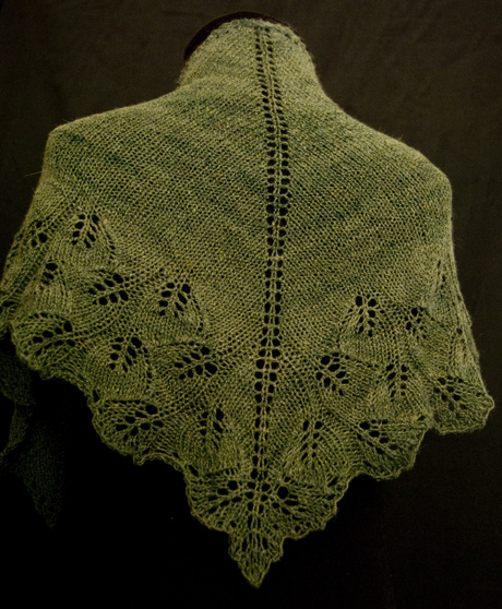 Eu estava pensando em queda e como todos nós gostamos de voltar para cores escuras após o brilho do verão e eu queria que o xale para ser grande, mas não pesado. Lace peso mohair é tão leve e arejado, o xale pode facilmente ser usado como um cachecol, ou mesmo um sarong. Eu gosto da surpresa assimetria das cores e formas deste xale, como muitas vezes parece diferente do que o esperado. A construção é bastante simples, mas do laço anterior tricô é recomendado O padrão de afiação é do Tesouro Segundo Barbara Walker de tricô padrões. O padrão de folha é de Lace Knitting Susanna Lewis. |