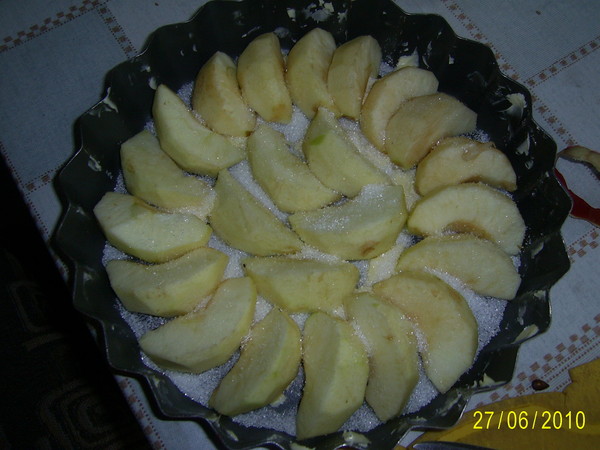 На дно формы натереть замороженное сливочное масло, засыпать его сахарным песком примерно на 0,5 мм. Разложить порезанные яблоки.