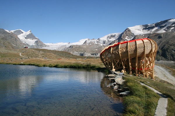 Деревянная спиралеобразная конструкция под названием Evolver, установленная на берегу швейцарского горного озера, позволяет посетителям взаимодействовать с природой, наблюдая панорамные пейзажи в уникальном интерактивном режиме.