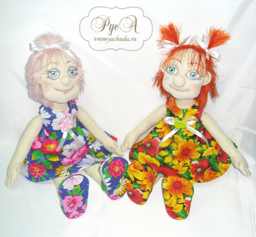 И я рада показать вам, мои дорогие, плоды своих трудов. Прошу любить и жаловать моих сладких девочек - карамелечек. Сарафанчики у девочек двусторонние, туфельки на жёсткой двойной стельке. Стелечки выкраивала из пластиковых коробок в которых покупаю мыльную основу. Их у меня скопилось большое количество, всё было жалко выкидывать, а тут отлично пригодились в дело. Рост 38 см. Сшиты: тело - бязь, платье - ситец, трусики - шёлк, волосы - пряжа YarnArt "Jungle" (у Галюси) и "Tango" (у Натуси).