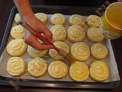 - За 5 – 7 минут до посадки в печь смажьте завитушки разболтанным яйцом.