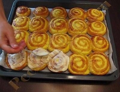 - Для заливки смешайте сметану с сахаром. Сразу же после выпечки обильно смажьте завитушки сметанной заливкой, плотно накройте и оставьте до полного остывания (или хотя бы до теплого).