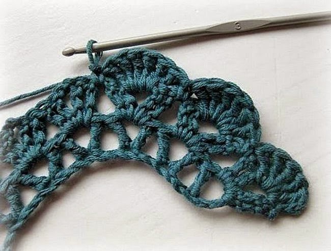 3 ряд: Из каждого окошка, образованного двумя воздущными петлями предыдущего ряда вывязать 2 столбика с накидом, 2 воздушные петли и еще 2 столбика с накидом.