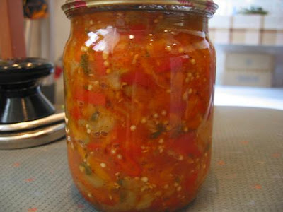 Потребуется: 1,5 кг белокочанной капусты, по 600 г моркови, лука, помидоров и болгарского перца, по 1/2 стакана растительного масла, сахарного песка и уксуса (9%), 2 ст. л. соли.