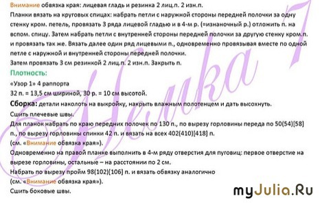 Сборка и отделка кофты: Набрать на спицу 54-55 петель вдоль краев передних полочек до начала выреза горловины и провязать 5 см. резинкой 4×4. На планке одной из полочек выполнить отверстия для пуговиц. Край выреза горловины и низ рукавов обвязать фантазийным узором. Край выреза горловины обвязать, попеременно провязывая 3 столбика с накидом и цепочку из 2 воздушных петель. 2-й ряд вязать фантазийным узором. Вязать, с каждого края убавляя по 1 петле в каждом ряду до высоты 33 см., после чего закрыть все петли. Таким же образом, обвязать 6 рядами фантазийного узора низ рукавов.