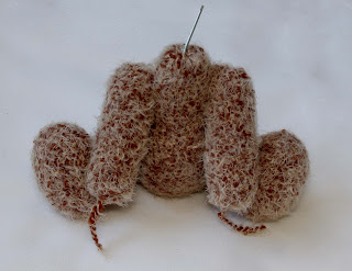 8 круг: ст.б/н в первые 6(6,7) петель, соед. ст. в след. 5(5,6) петель, пропустить след. петлю, ст.б/н в след. 3 петли, пропустить след. петлю, соед. ст. в след. 5(5,6) петель, ст.б/н в след. 5(5,6) петель, соед. соединительным столбиком, закрепляем и обрываем нить.
