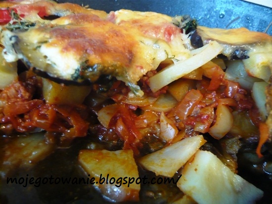 Далее выкладываем слоями в форму :картофель-баклажаны-картофель-фарш-картофель-фарш-картофель.Сверху выкладываем оставшиеся баклажаны и кружочки помидоров.Накрваем фольгой и вставим в духовку,(180 гр) минут на 30.
